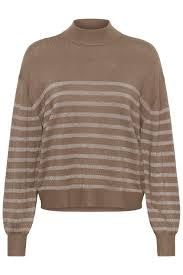 Striped sweater features a straight silhouette with long sleeves and mock neck. Subtle shine in the horizontal stripes adds a modern touch to its ribbed cuffs and hem.