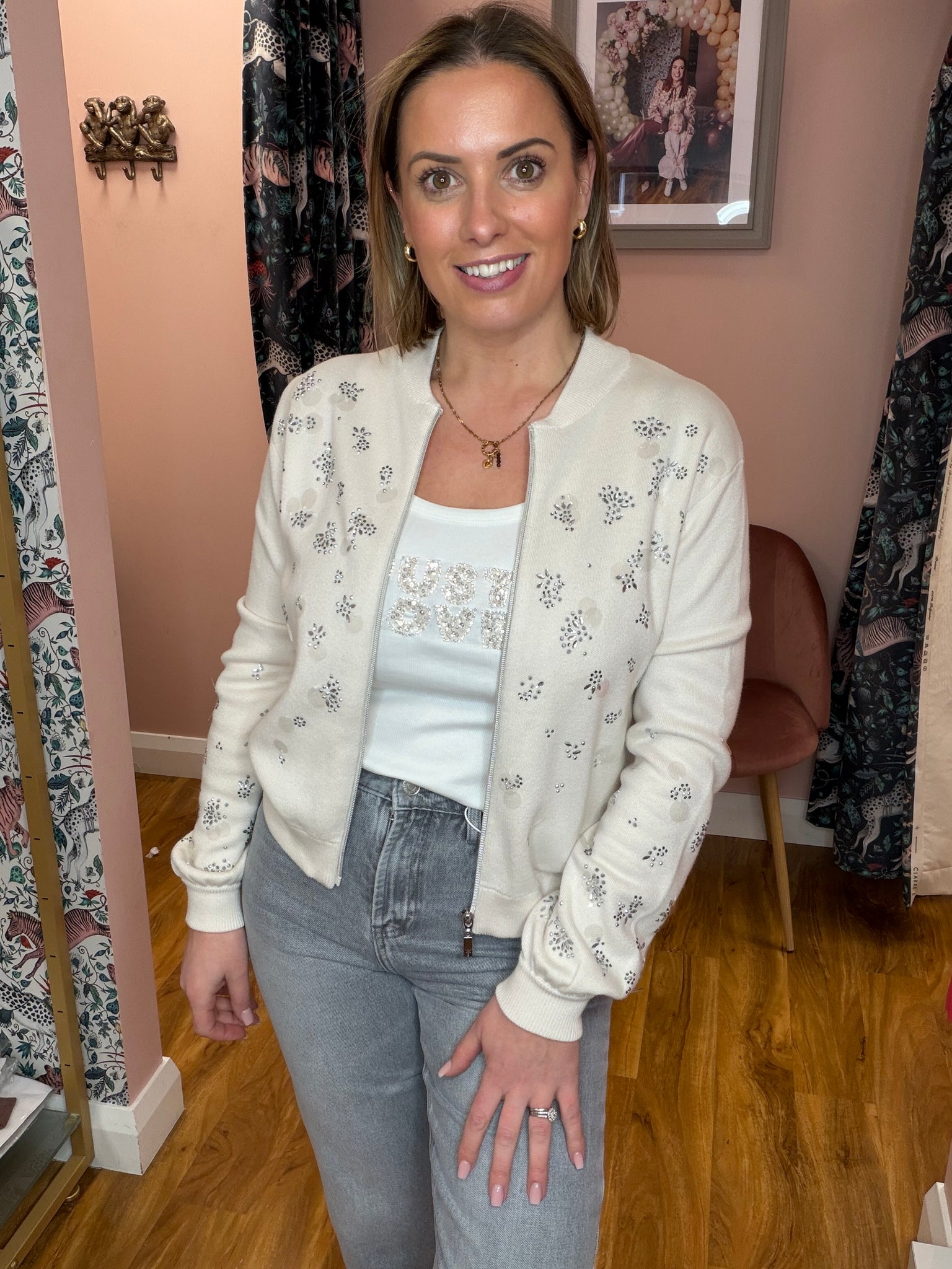 Elegant cardigan made of 100% cotton with decorative details, round neckline, and ribbed sleeve cuffs – a timeless companion