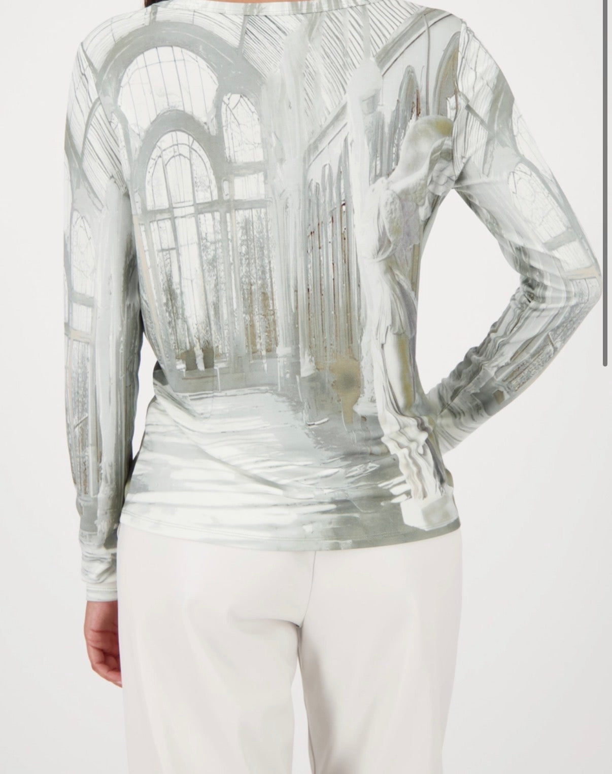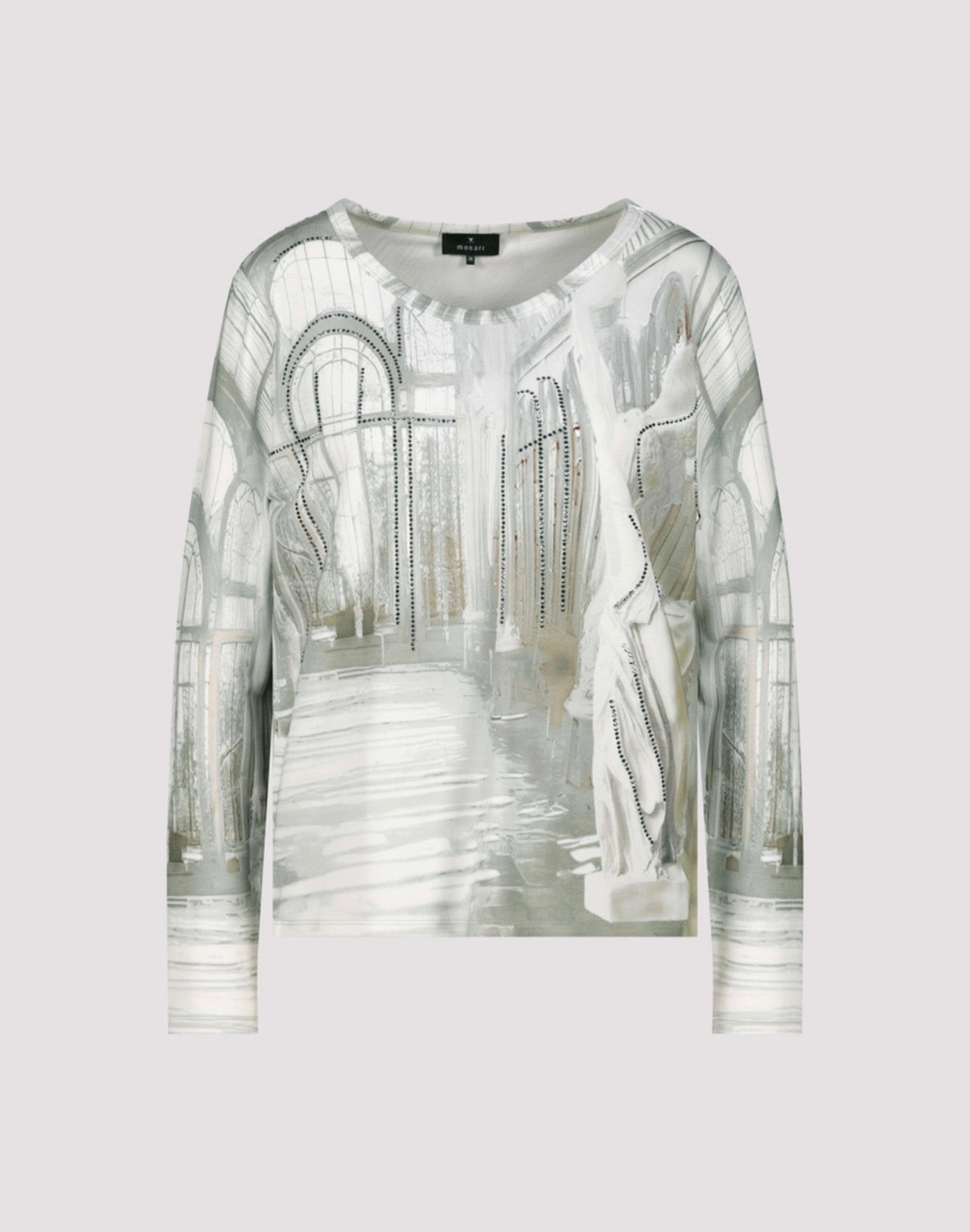 Elegant long-sleeve shirt made of flowing viscose, adorned with rhinestones and an artistic gallery print for style-conscious women.