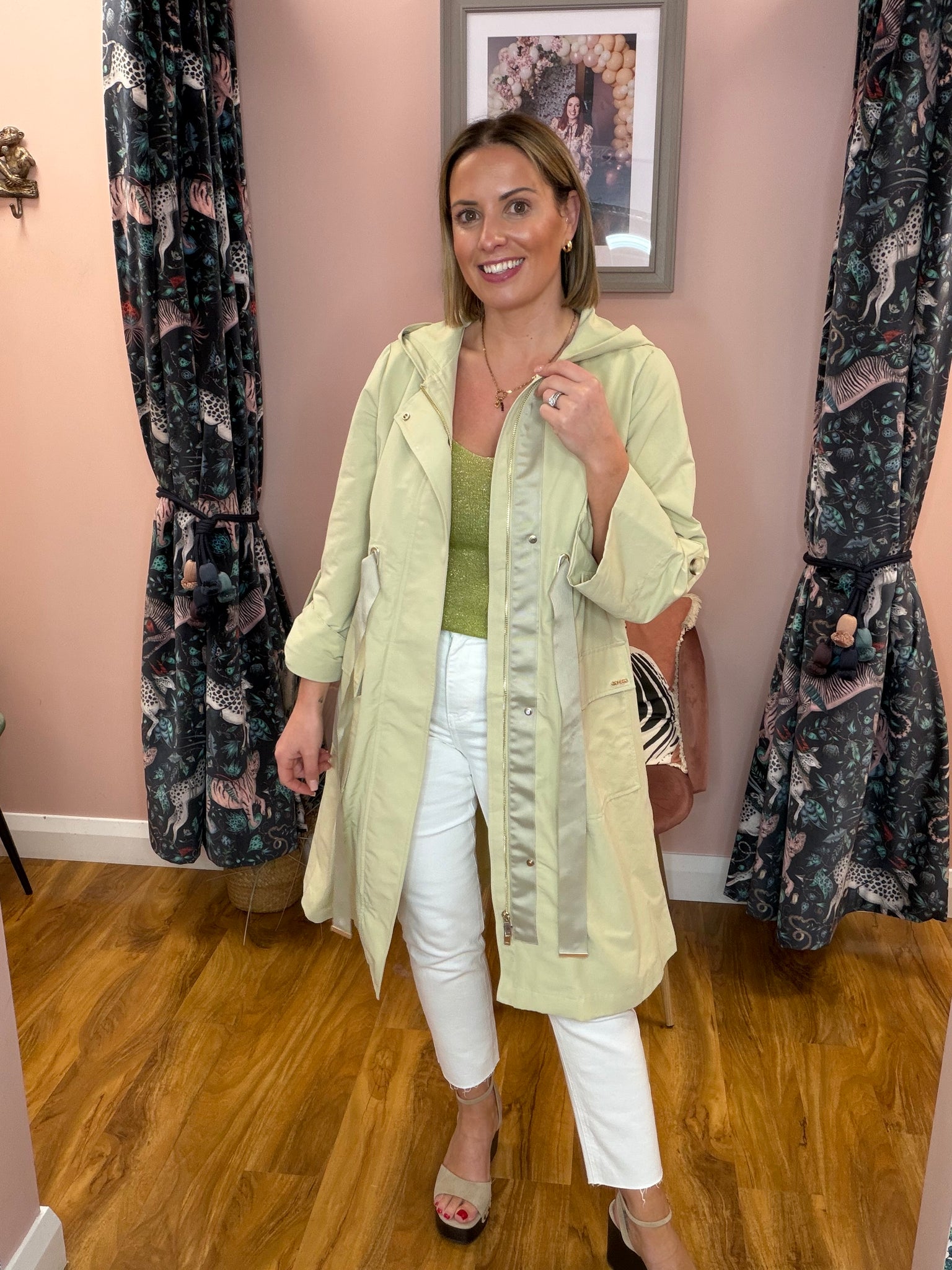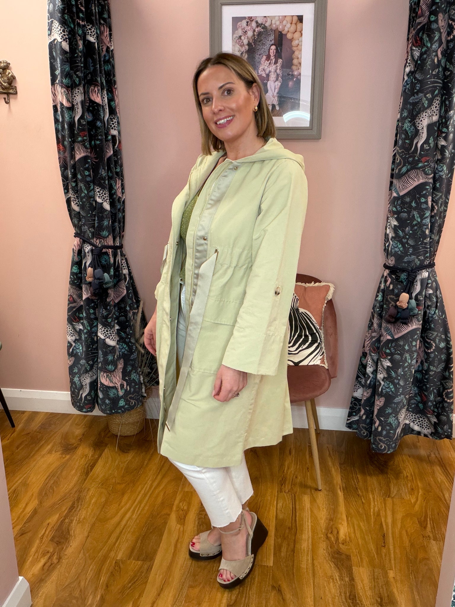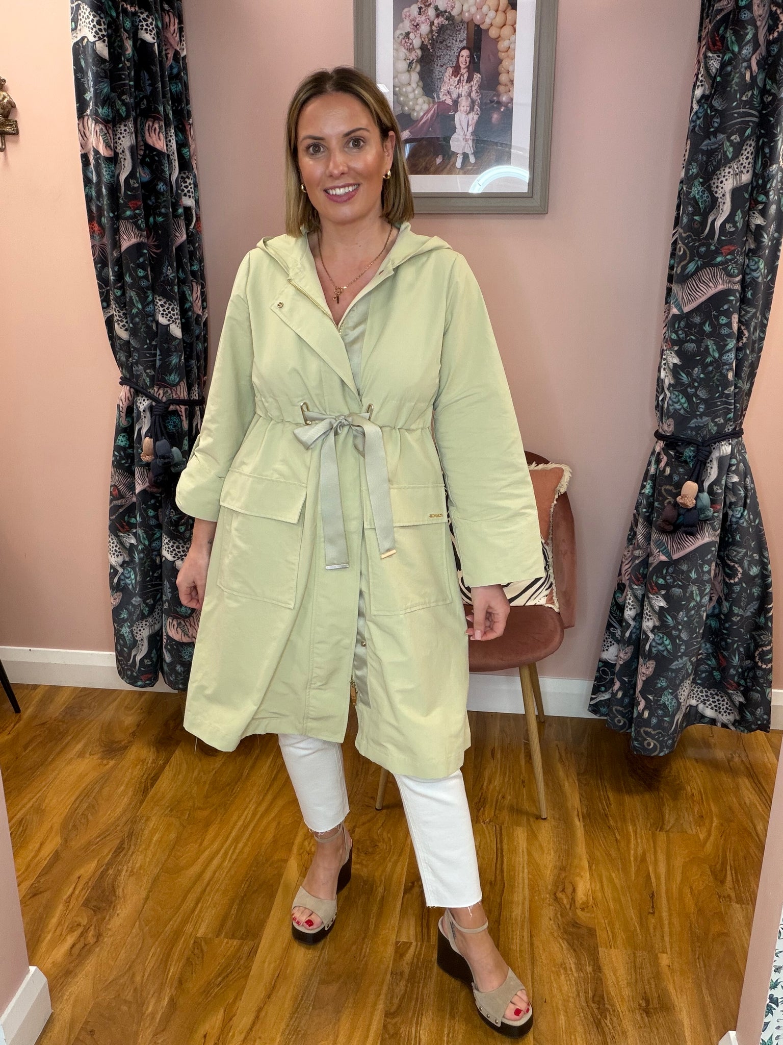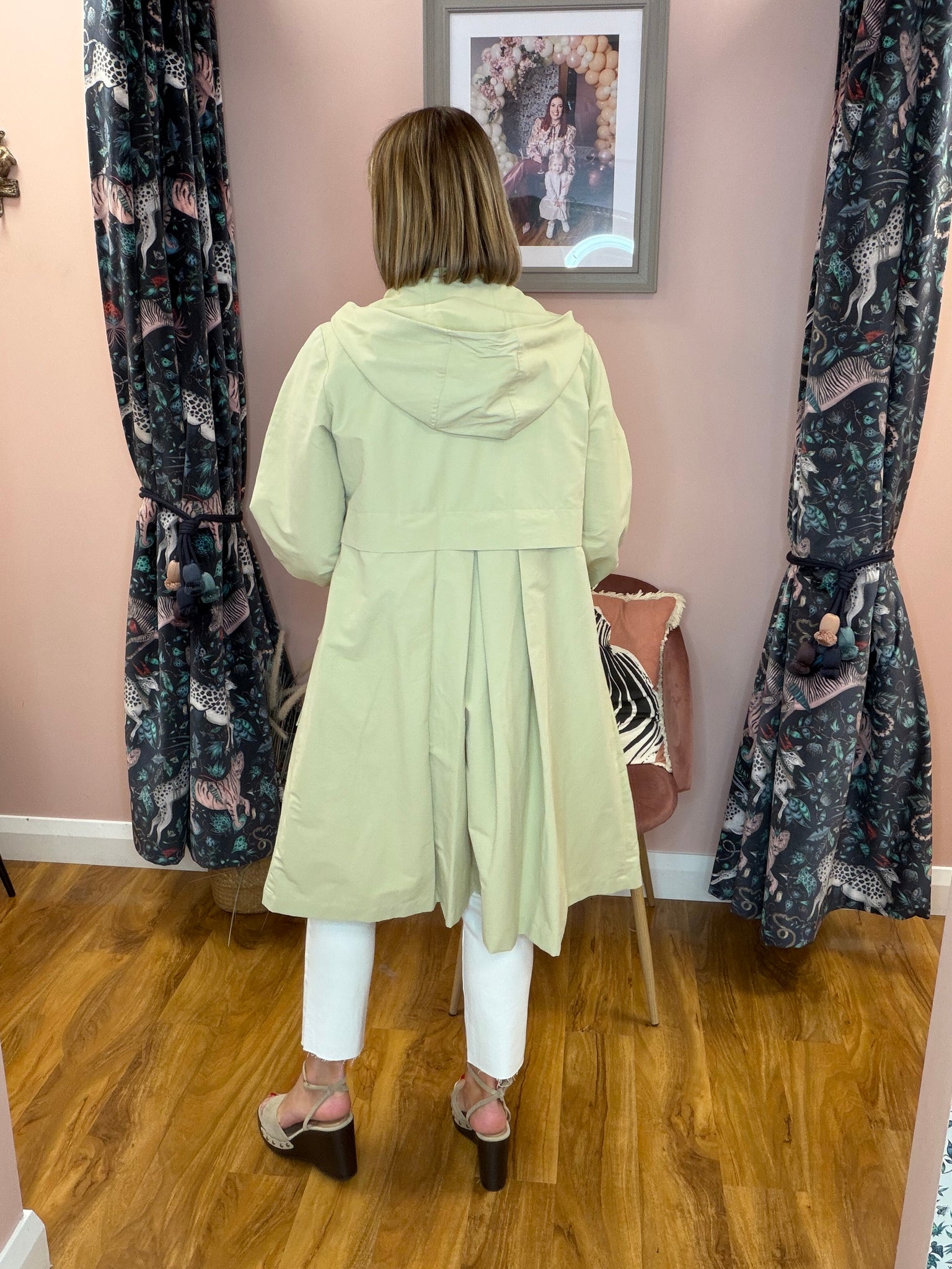 Elevate your outerwear game with this distinctive trench coat that breaks the mould. Crafted in a calming sage hue, it features a striking pleated back for added movement and visual interest, paired with an elegant ribbon tie detail at the front. The generous fit ensures comfort and versatility, making it perfect for layering through the seasons. A modern twist on a classic silhouette that effortlessly transitions from day to night.