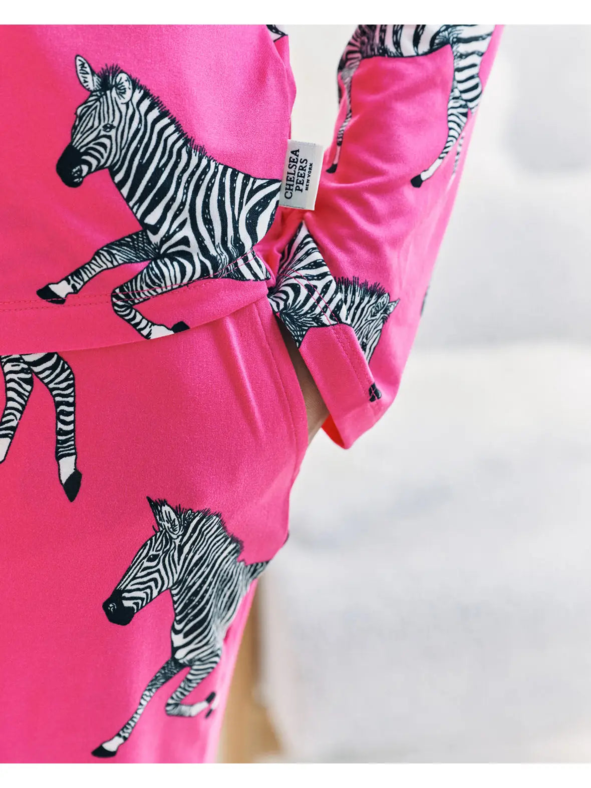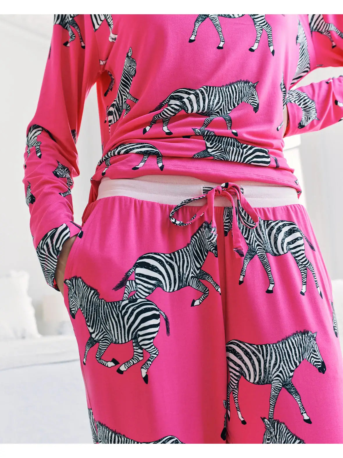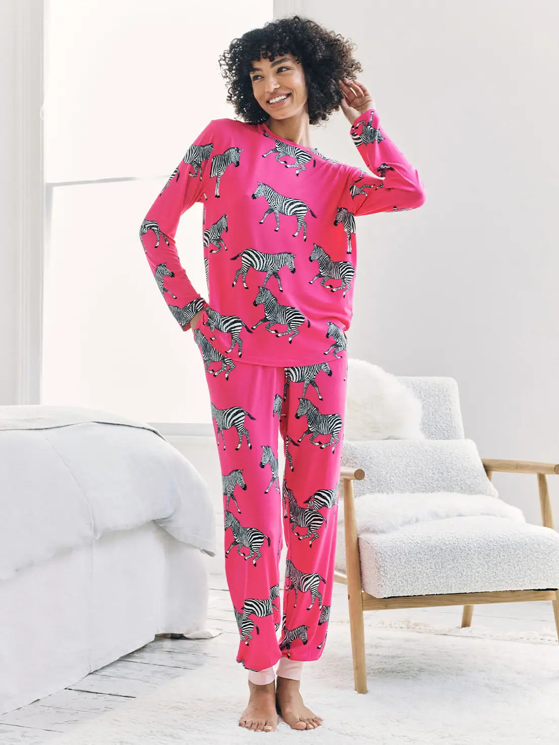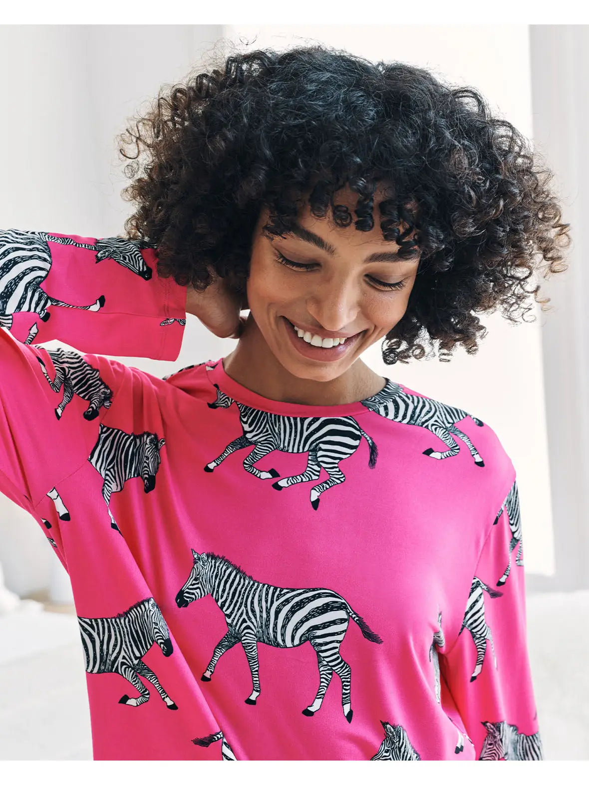 - Bring a pop of colour to your evenings with our bold hand-drawn zebra print, crisp in white against a vivid hot pink base. Made from 95% recycled fibres jersey, the fabric is soft, breathable and designed to move with you. The long-sleeved crew neck top pairs with full-length bottoms, finished with an elasticated drawstring waist, soft leg cuffs and handy side pockets. Striking and comfortable in equal measure, this is downtime dressing done right. Iconic print, all-night comfort.