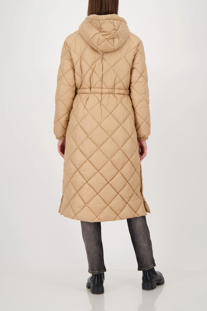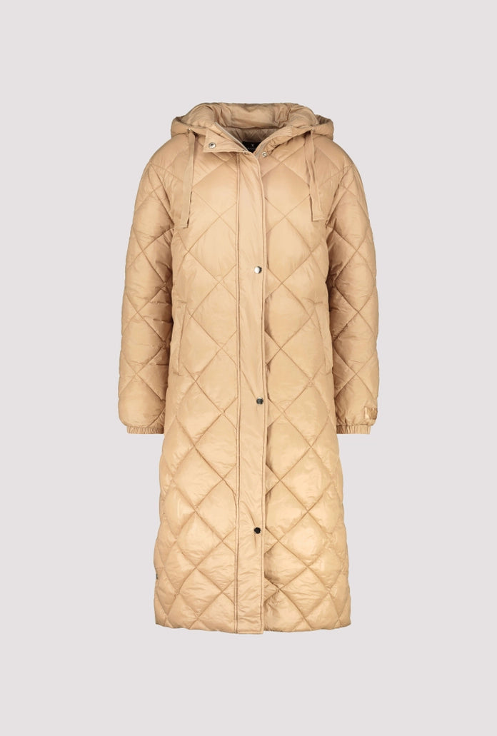 Modern quilted coat with hood, elegant snap button closure and practical pockets. Ideal for stylish appearances in cold weather.
