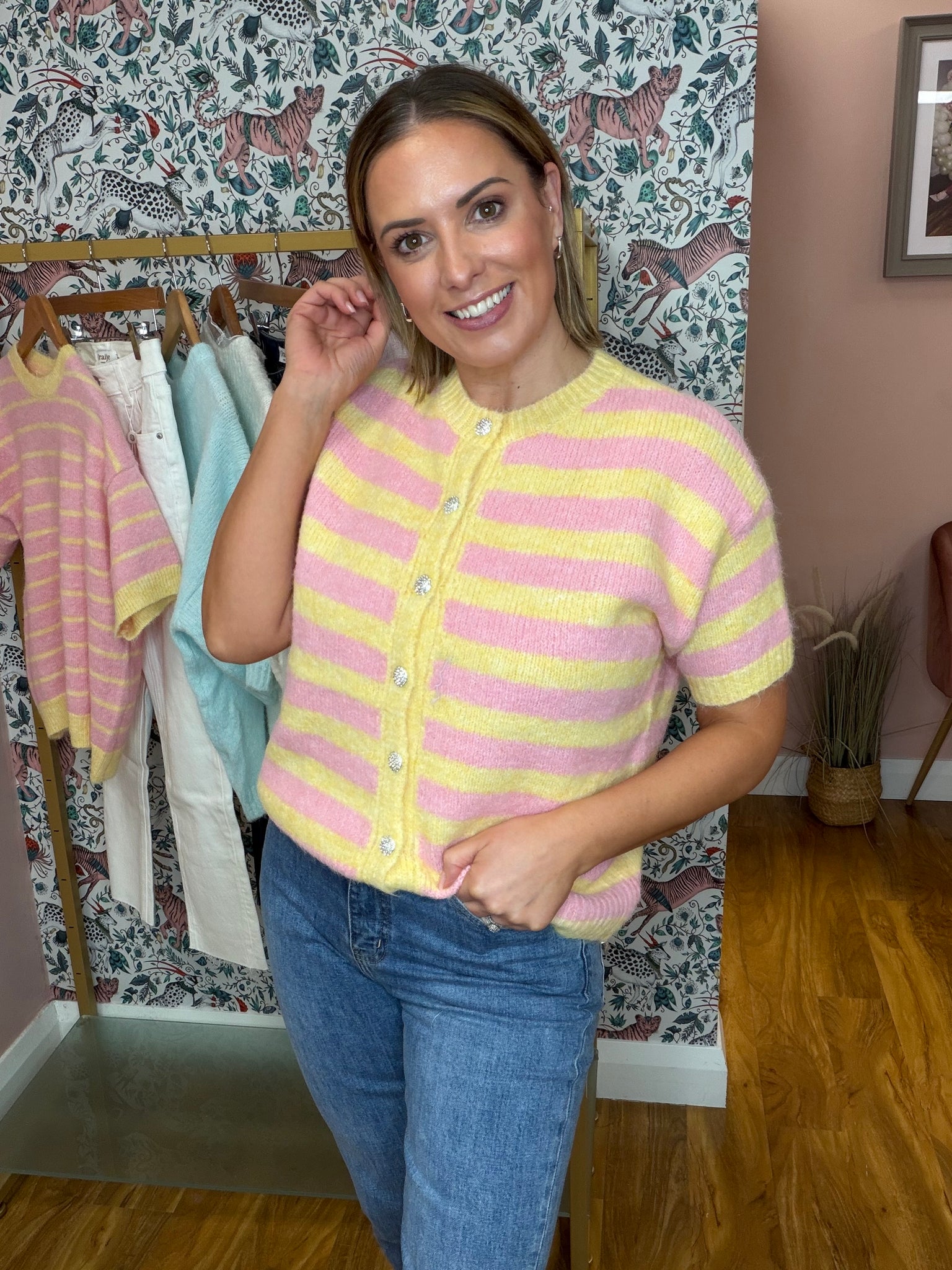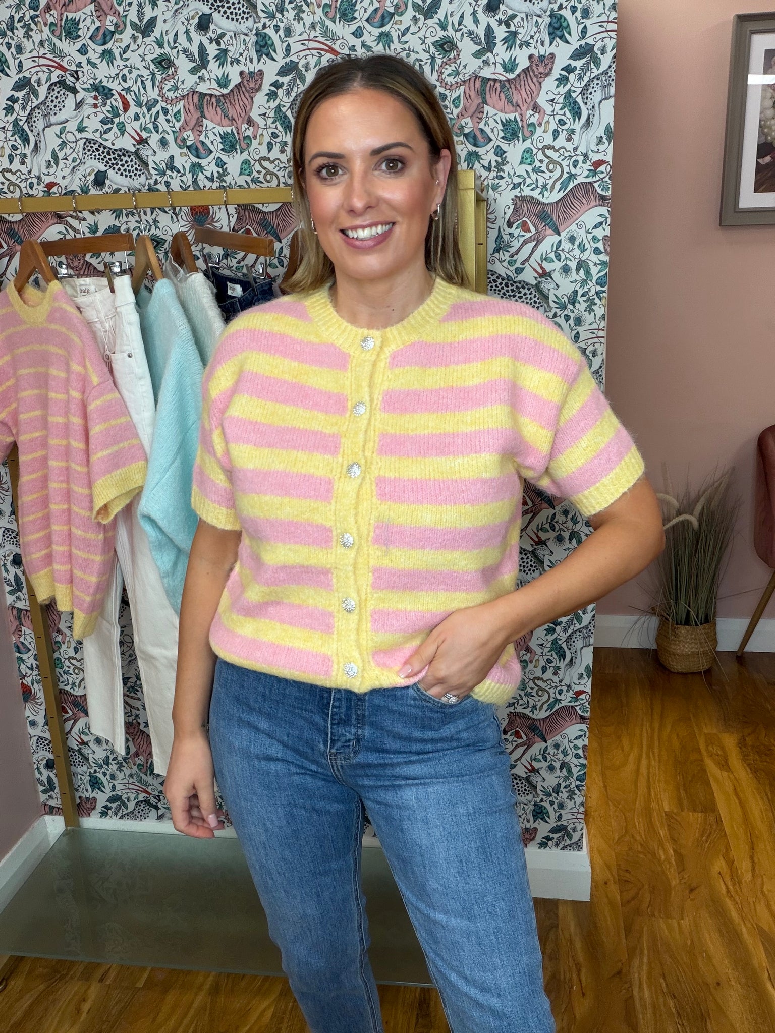 Layer up with personality in this delightful striped cardigan. Cheerful lemon and pink stripes dance across a soft knit base, while gleaming silver buttons add a touch of sophistication. The short sleeves make it ideal for transitional weather or throwing over your favourite tee. Perfect for sizes 8-14, this versatile piece brings instant joy and effortless style to any ensemble.