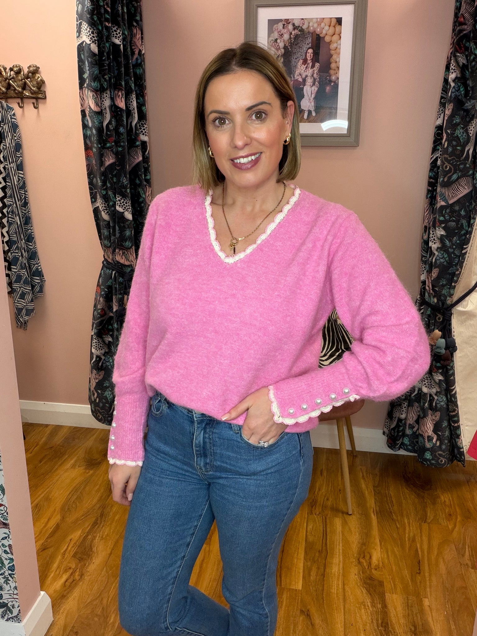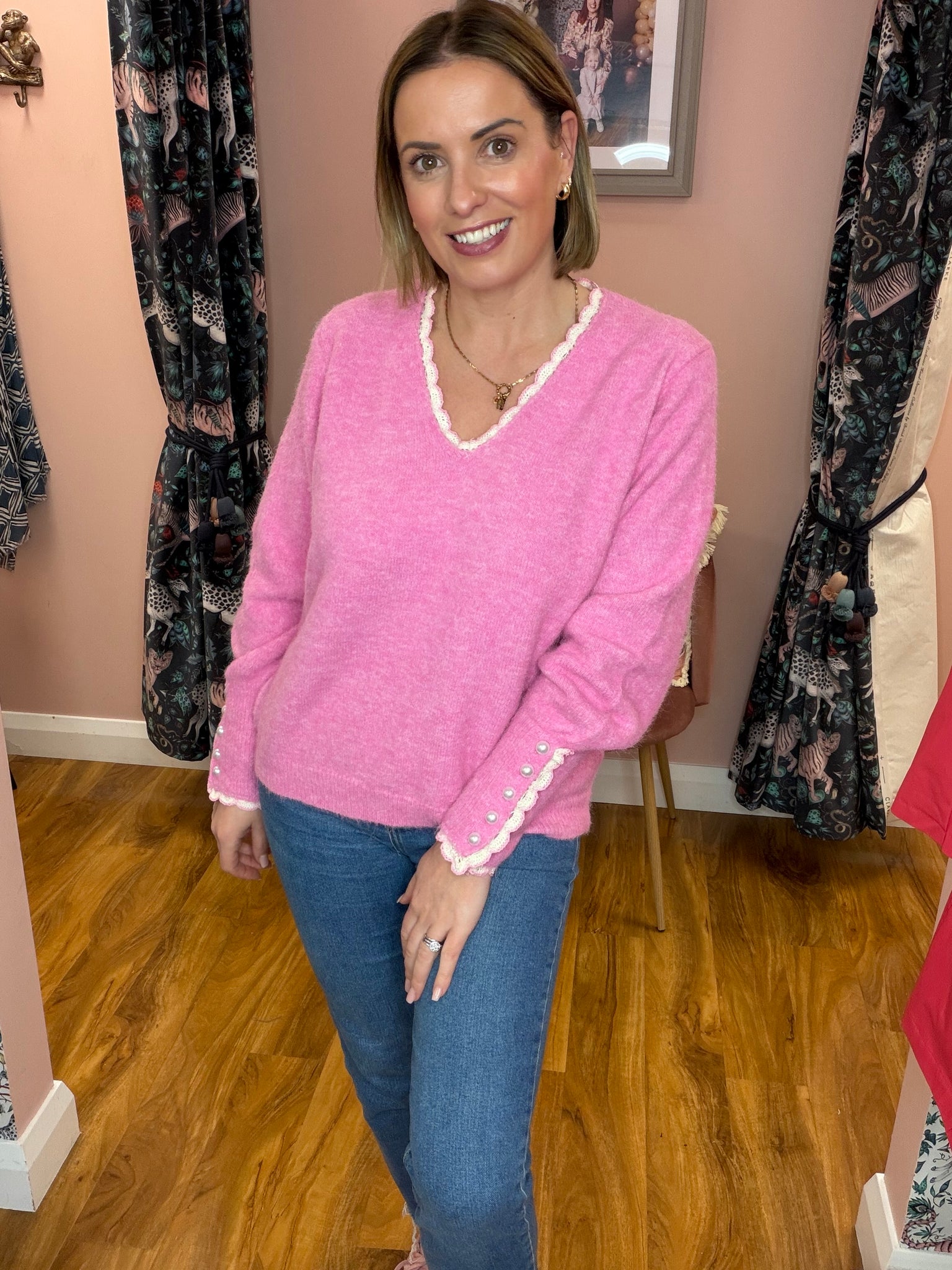 Elevate your everyday wardrobe with this versatile V-neck knit, designed to flatter a range of sizes (8-14). The striking fuschia pink base is beautifully complemented by delicate pale pink lace trim adorning the neckline and cuffs, while pearl button detailing on the cuff adds a touch of refined elegance. Perfect for layering or wearing solo, this piece transitions seamlessly from casual to smart-casual styling.