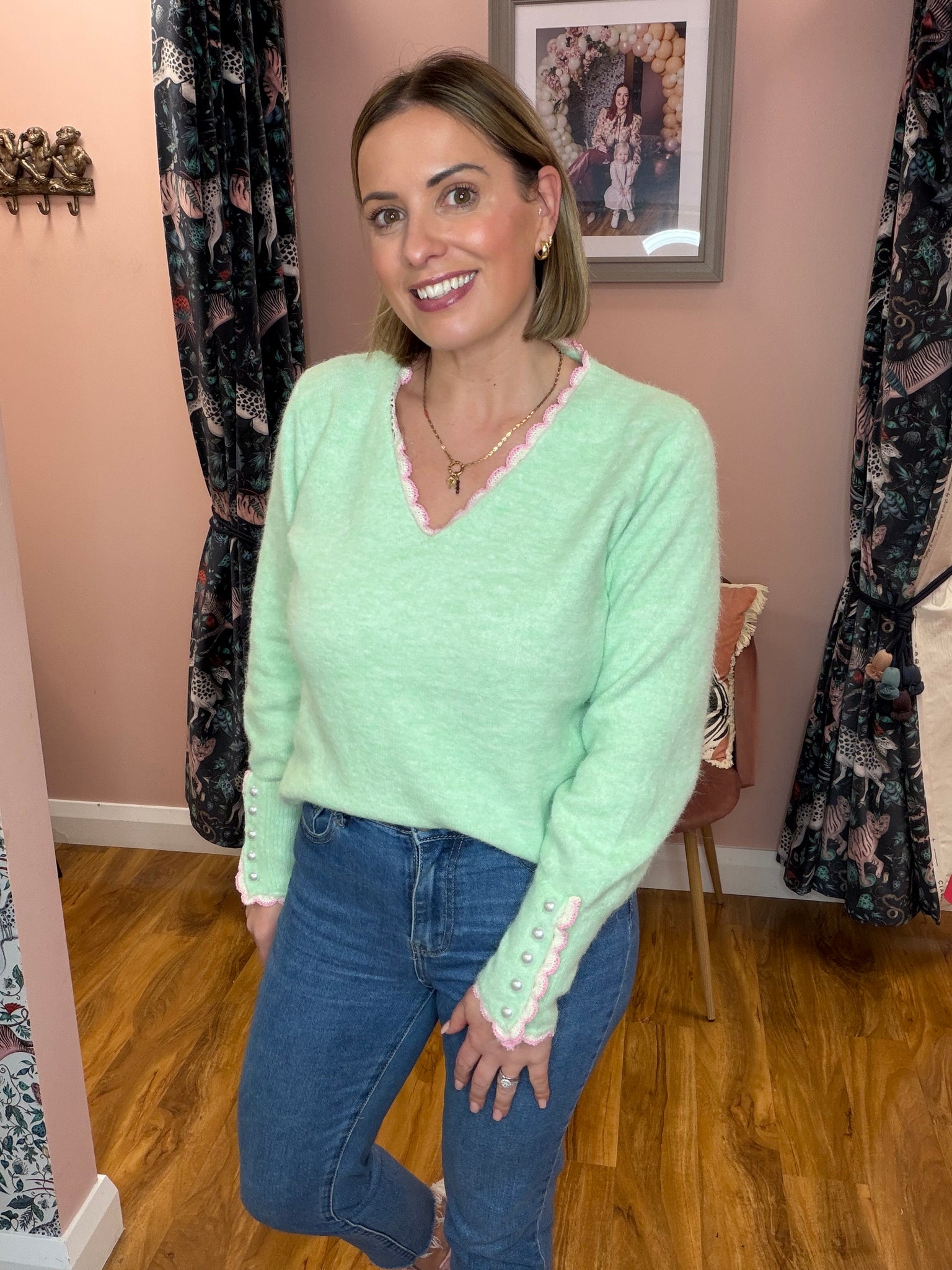Elevate your everyday wardrobe with this versatile V-neck knit, designed to flatter a range of sizes (8-14). The striking Mint base is beautifully complemented by delicate pale pink lace trim adorning the neckline and cuffs, while pearl button detailing on the cuff adds a touch of refined elegance. Perfect for layering or wearing solo, this piece transitions seamlessly from casual to smart-casual styling.