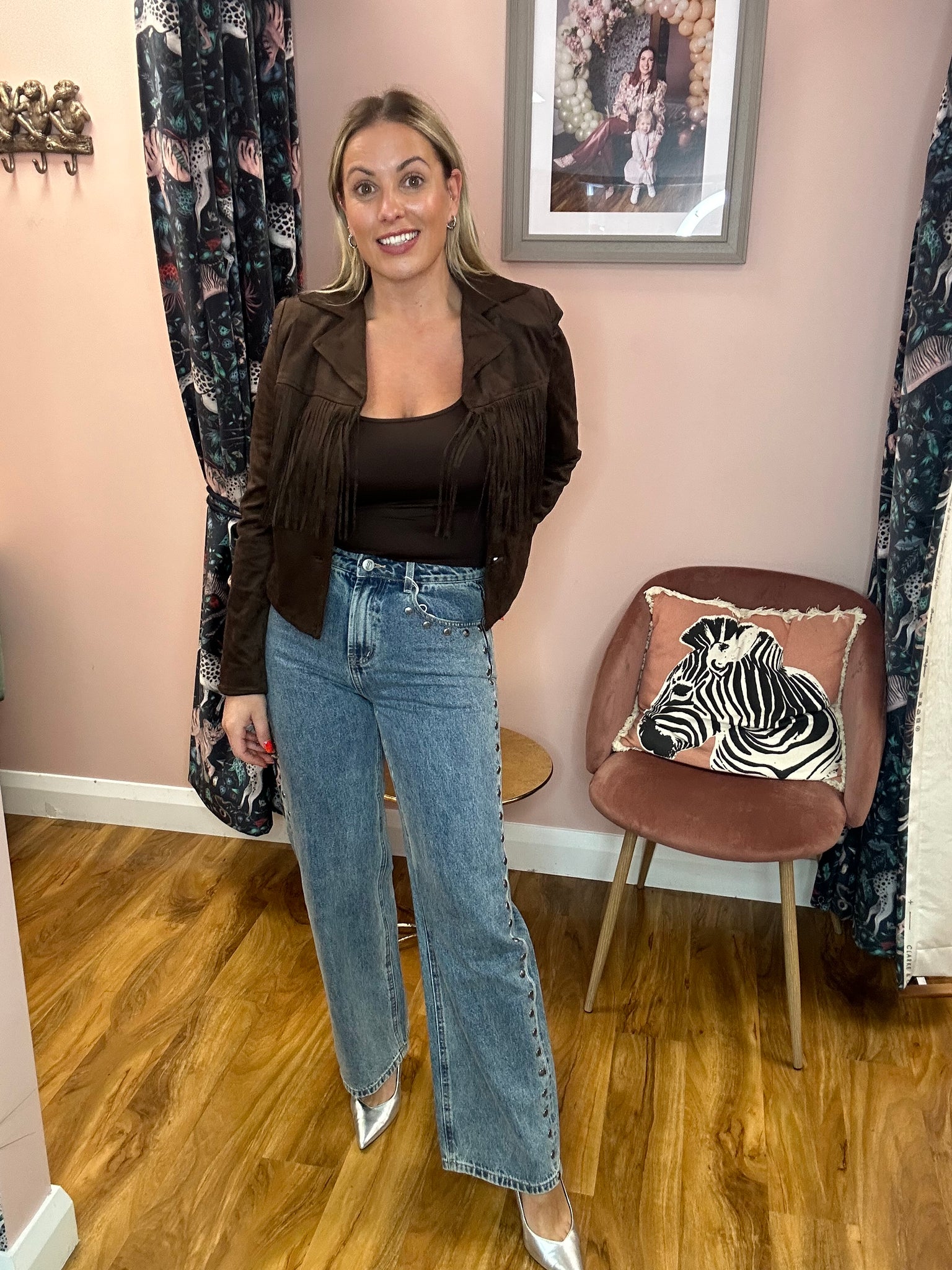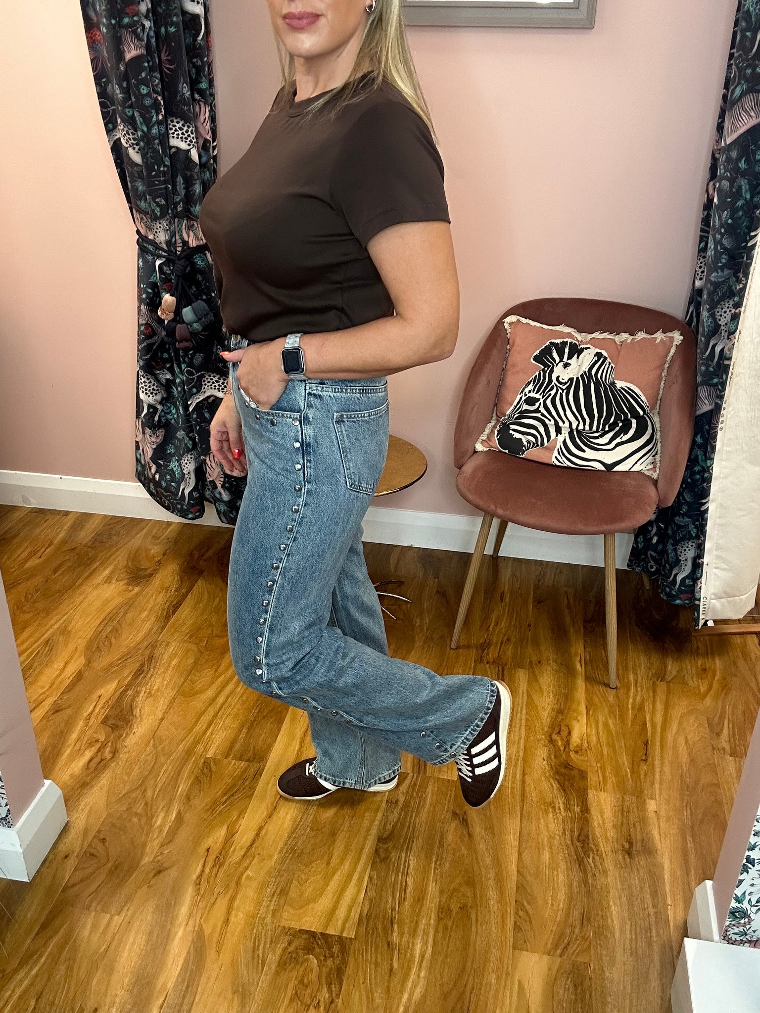 non stretch denim, come up slightly small fit due to the non stretch aspect of the denim. brushed silver studs decorate the side seams nd pockets